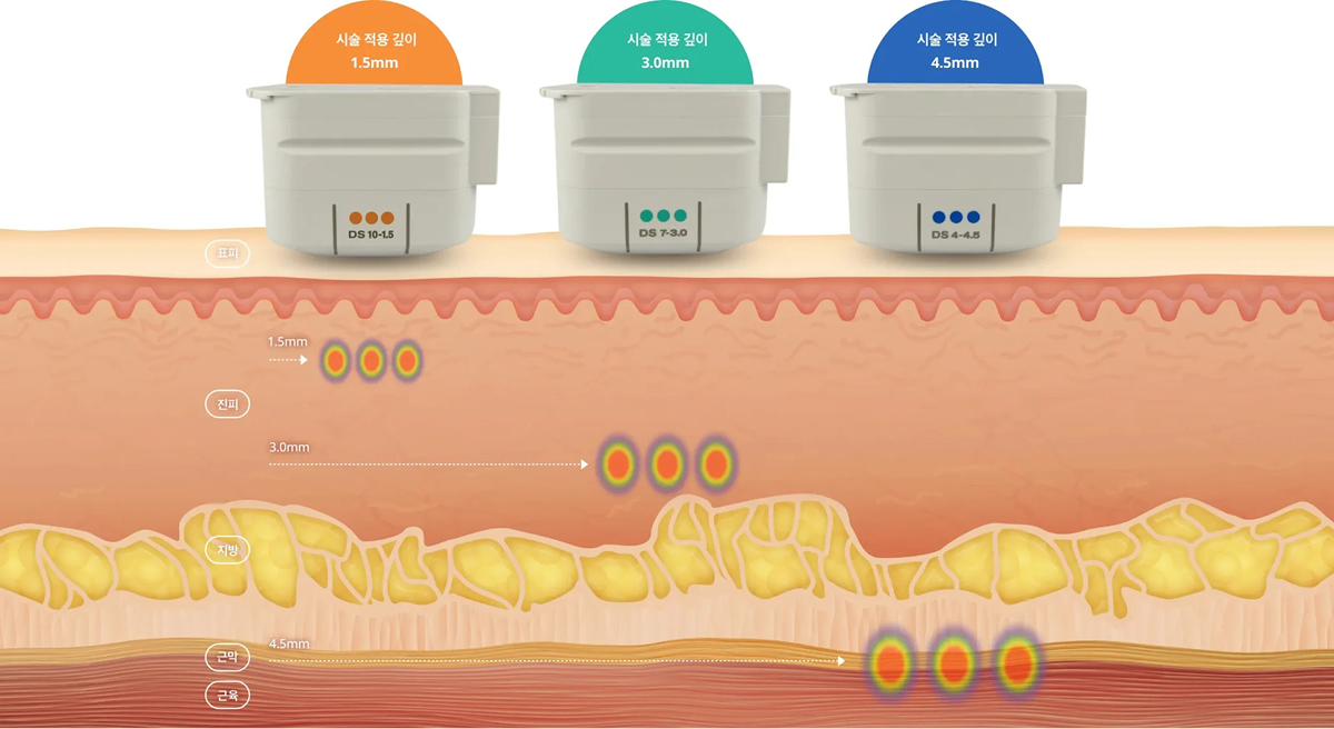 울쎄라피 프라임™은 1.5mm, 3.0mm및 4.5mm의 다수의 깊이를 시술하므로, 표적 조직(진피, SMAS층) 모두를 목표로 합니다.