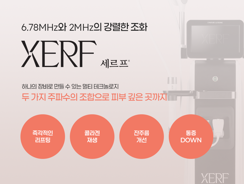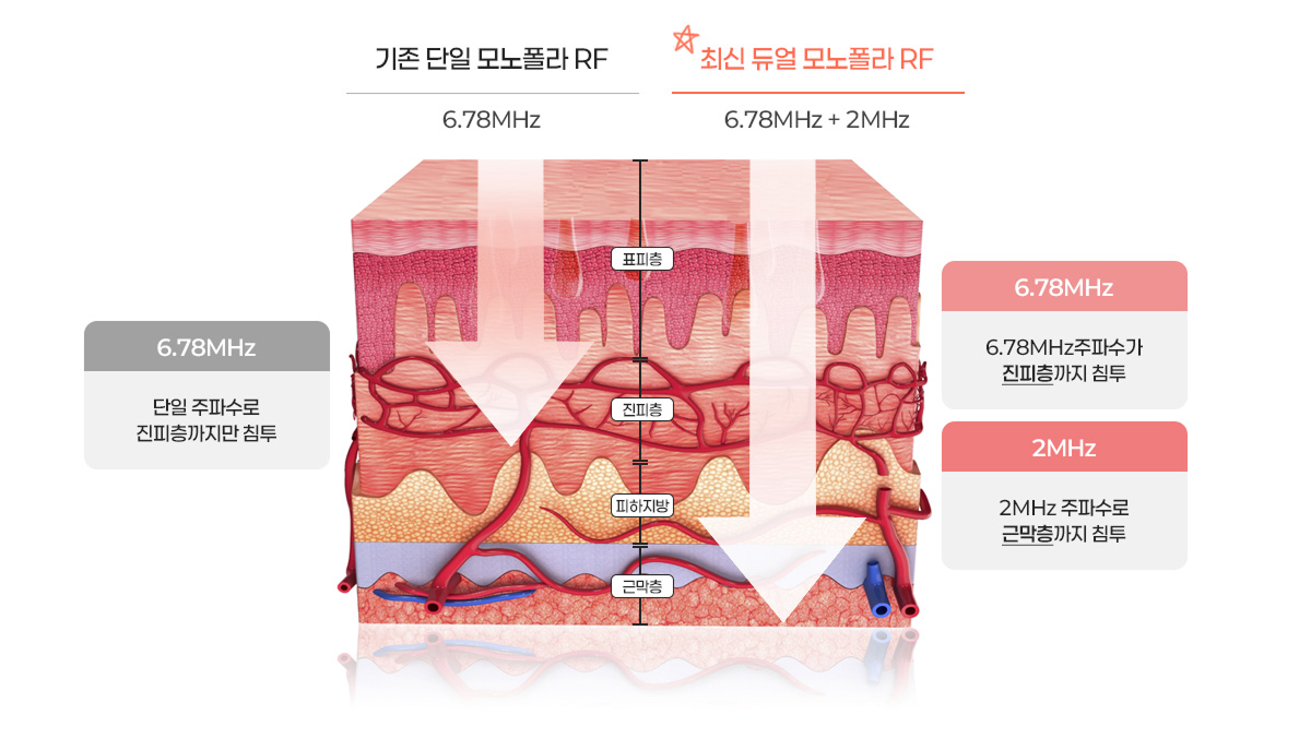 2MHz 와 6.78MHz 두가지 주파수의 조합으로 피부 깊이 열에너지를 전달하는 모노폴라RF장비입니다.